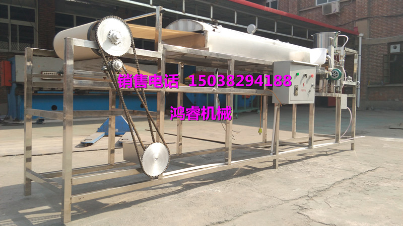 鸿睿全自动凉皮机是我厂经多年生产技术经验,结合相关的专家及河粉厂家,新研制的新一代自动型凉皮机,解决了传统凉皮机的各种缺点,该凉皮机采用直热式加温,选用国内先进的自动点火技术、环保的天然气或液化气加热,解决了传统凉皮机的点火难和耗能大的缺点,且加装了自动磨浆和自动摆粉配置,解决了传统凉皮机劳力大的缺点,开创了一个人可以生产凉皮的先例(可免费先试后订)。