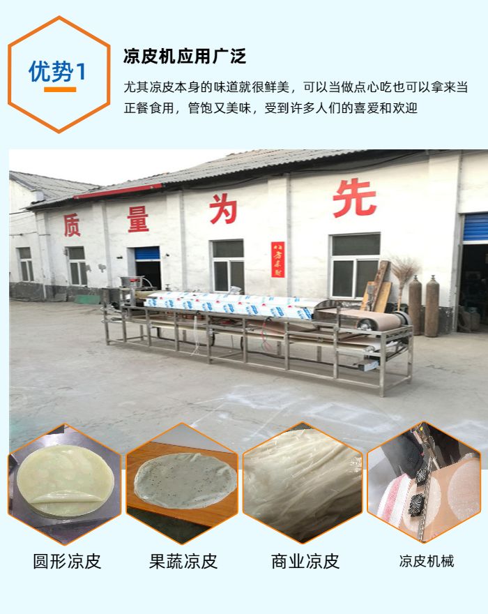 以往加工凉皮,人们都是通过手工的方式进行生产,卫生成为了很多人关注的问题。凉皮机 的出现,改变了以往传统粗放经营的模式,它可以把凉皮很好地进行加工,即安全又卫生,并且做出来的凉皮色泽度更好,市场反馈食用起来口感更好。随着生活水平不断提高,人们对凉皮的要求也越来越高,因此,投资凉皮加工,生产真正口感好的凉皮是一项风险低而且发展空间巨大的项目。