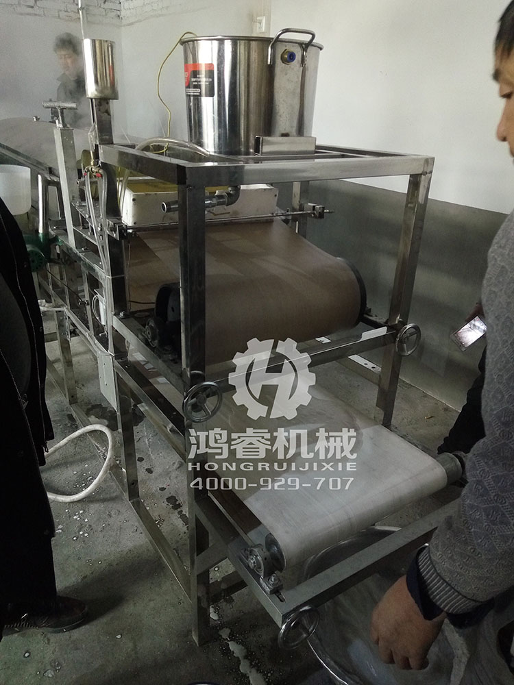 鸿睿 全自动凉皮机 构造简单,操作更简单。整机全部采用不锈钢制造,简单大方,易清洗,更耐用。传送带用的是耐高温食品机不沾带,易清洗、强度高、抗拉伸。传送带还配有红外线感应自动纠偏装置,机器长时间工作时,传动带会稍微偏离位置,红外线感应到了就会开启自动纠偏装置。